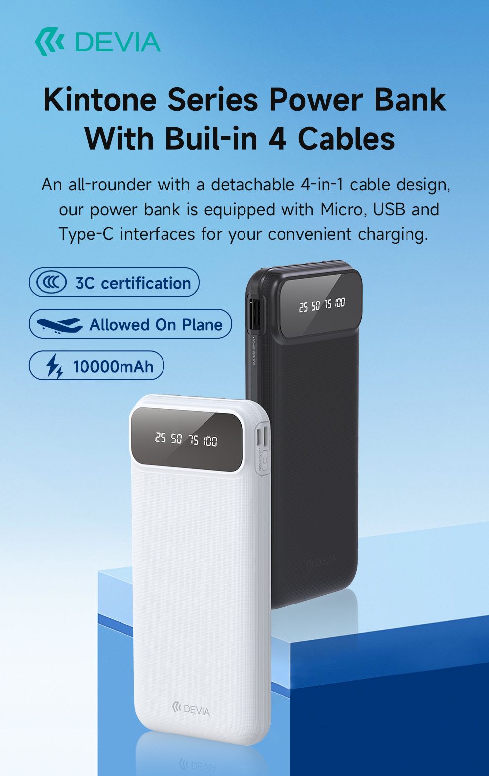 DEVIA Kintone Series Power Bank With Built-in 4 Cables (10000mAh)