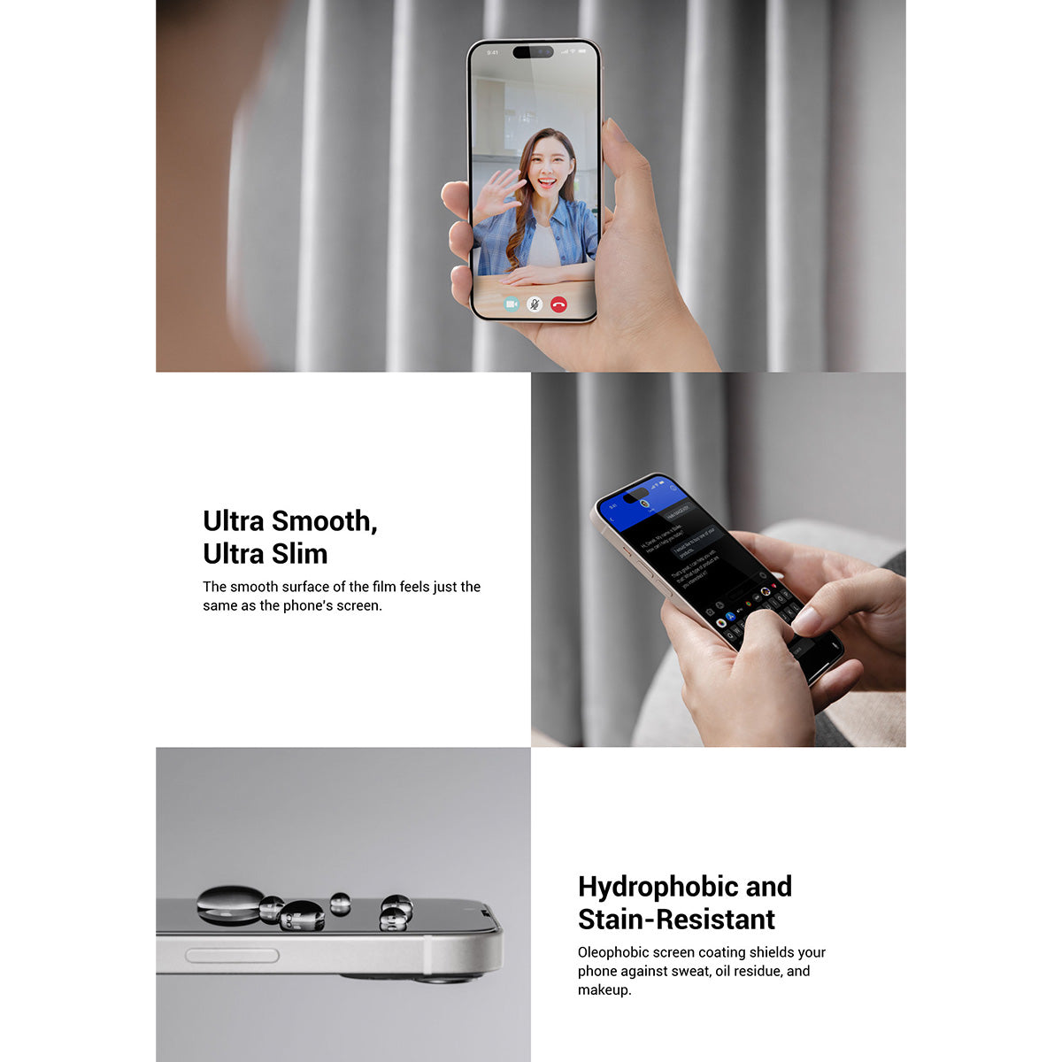• Oleophobic screen coating shields your phone against sweat, oil residue, and makeup. If you're seeking a hydrophobic and stain-resistant screen protector, this is the perfect choice.