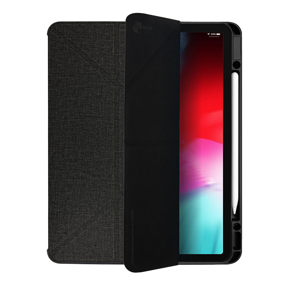 Our Power Support JTLEGEND AMOS Series Air Jacket Folio Case with Pencil Holder for iPad Pro 12.9" (2022/2021) Black just got an upgrade with the stylish and protective cover by Amos. The solid black polycarbonate case is thin and strong, with a stylish fabric like texture. Our exact cutout design ensures that the camera, buttons, and ports are protected and accessible. The fashionable AMOS fabric-like textile cover protects the screen with an ultra-fine faber cloth lining and a matte-finished polycarbonate outside casing. A special pocket built into the Air Jacket holds the Apple Pencil in place. Need to take a photo when the cover is over the camera? Don’t worry, the quick camera access corner flips out of the way so you can capture wonderful images at any time. The cover can be folded to prop-up the iPad Pro 12.9” in either the horizontal or vertical position providing multiple ergonomic viewing options.